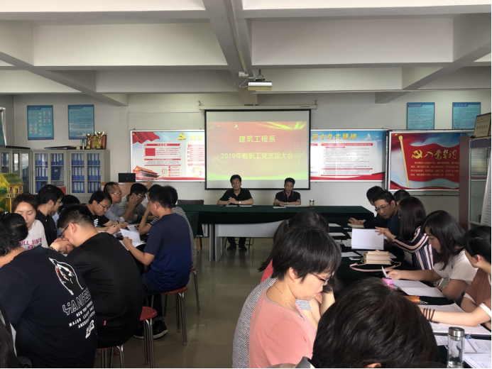 2019年6月21日下午2点00分,建筑工程系党支部教职工党员转正大会及七一评优大会于2号教学楼3楼学术报告厅举办。会议由建筑工程系党支部书记任旭东主持,建筑工程系党支部39名党员出席。