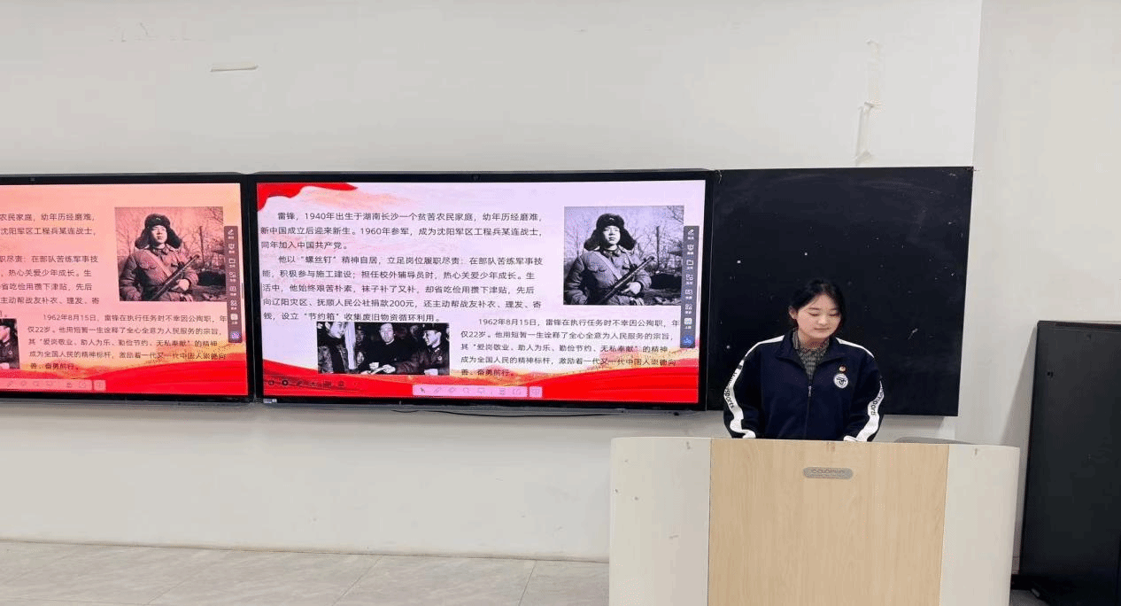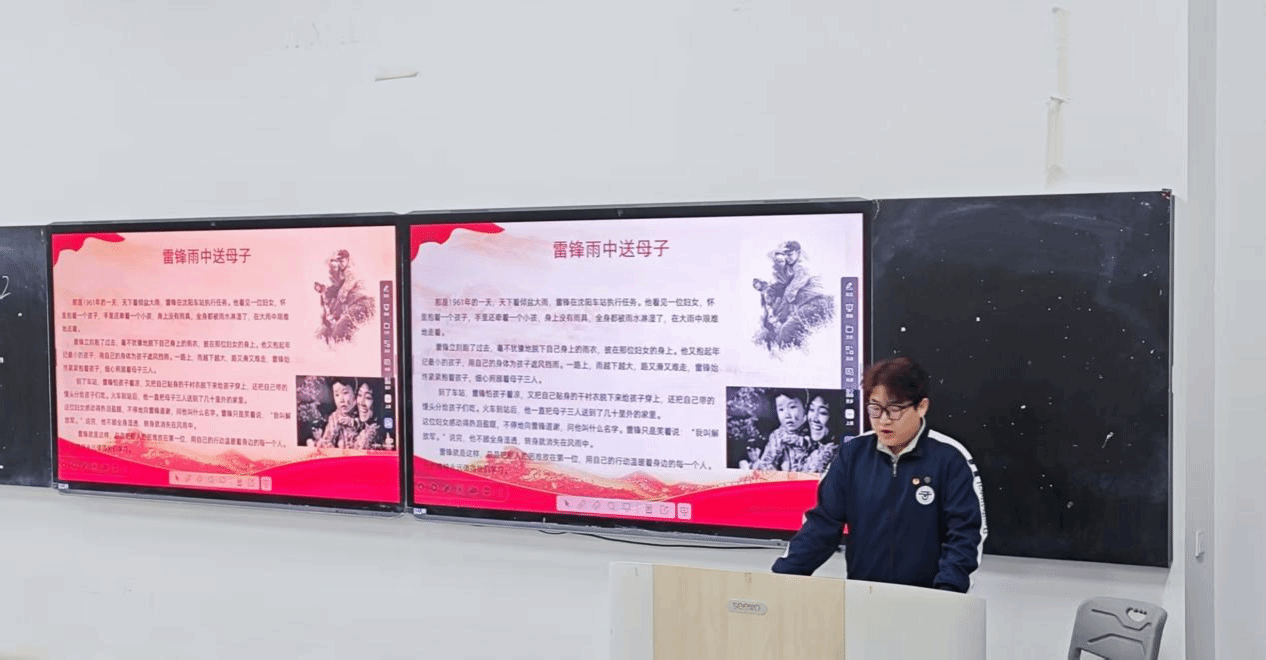 在今天的雷锋事迹分享会上,第一位主讲人成婷婷同学深情讲述了“雷锋背送老大娘寻子”的感人故事。故事发生在沈阳车站,雷锋遇到一位白发苍苍、背负沉重行李的老大娘,得知她要去抚顺找儿子,便主动上前搀扶、背起行李,一路细心照料,最终历经两个多小时帮助老人与儿子团聚。主讲人同学通过这个故事,生动展现了雷锋同志尊老爱幼、乐于助人的高尚品格,号召同学们从身边小事做起,做有温度、有担当的新时代青年。