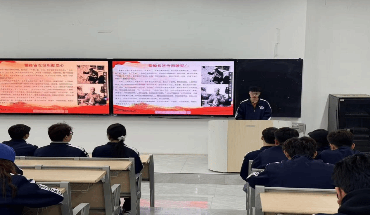 第三位主讲人张继伟同学讲述了“雷锋省吃俭用献爱心”的故事。雷锋生活极其节俭,袜子补了又补,却把省下的200元津贴全部捐给灾区和困难公社。主讲人同学通过这个故事,引导大家思考“节俭”与“奉献”的深刻内涵。她呼吁同学们学习雷锋“对自己节俭、对他人慷慨”的精神,从节约一滴水、一粒米做起,把爱心和责任感融入生活,争做新时代的“小雷锋”。