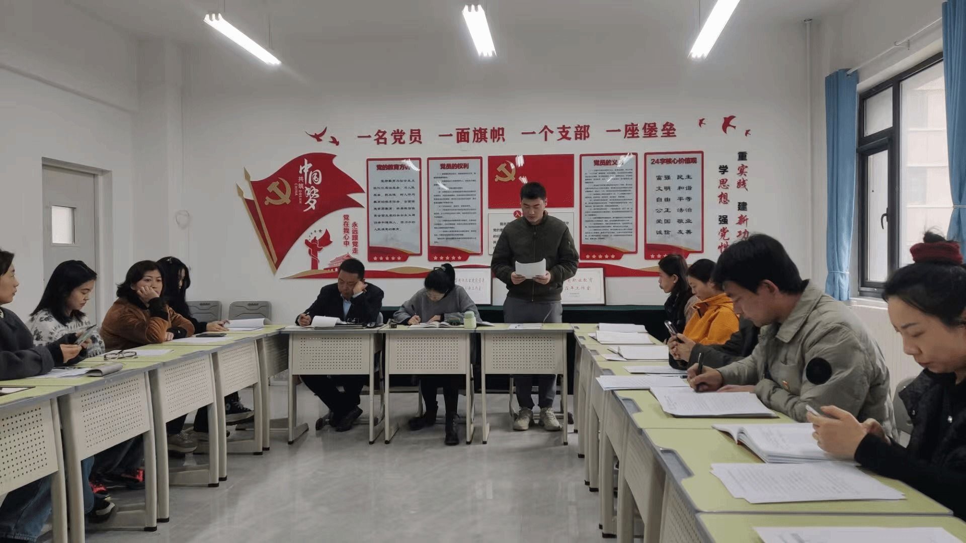 赵富荣代表支委班子作年度述职,从政治建设铸魂、组织建设强基、作风建设塑形、业务融合赋能四个维度总结工作成效。过去一年,支部通过 “三会一课” 创新实践,实现党建与教学科研深度融合,在省级职业技能大赛中斩获佳绩。