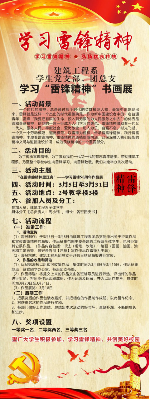 随着2019年3月5日学雷锋纪念日的临近,社会各界纷纷开展读书、观影等系列活动,大张旗鼓地宣传、弘扬雷锋精神,为积极响应,深入学习“雷锋精神”,建筑工程系团总支和全系同学在系党团干事和学生会的组织领导下,在校本部及康乐校区开展了为期一个月的“学习雷锋,大型书画展”活动。