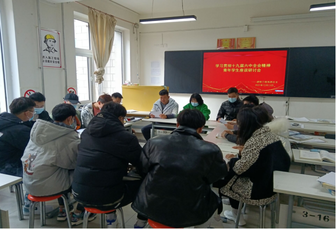 2021年12月13日,建筑工程系团总支学习研究阐释党的十九届六中全会精神专题研讨会在兰州、康乐两校区同步举行。兰州校区在20级建工2班由建筑工程系团总支书记周小钰老师主持举行。康乐校区在21级建工1班由建筑工程系21级年级组组长王睿老师主持。