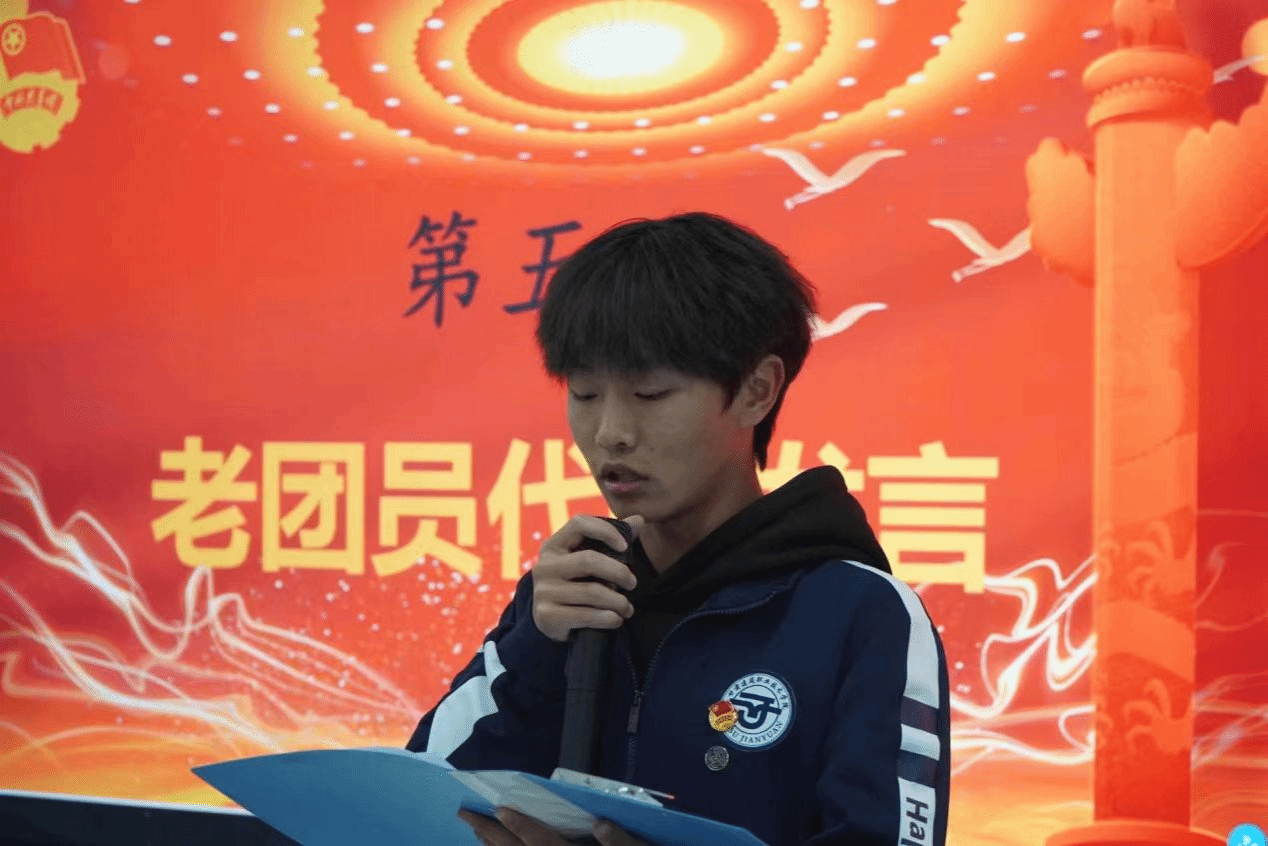 老团员代表建筑工程技术八班的陈代忠同学则以“传承与奋进”为主题,讲述入团以来成长蜕变,于志愿服务体会奉献价值、在校园活动锻炼综合能力、从理论学习筑牢思想根基。激励新团员珍视身份、善用平台,在团组织熔炉中,传承五四精神,磨砺意志、提升素养,在时代舞台绽放芳华,尽显“传帮带”责任担当,为新团员传递榜样力量。