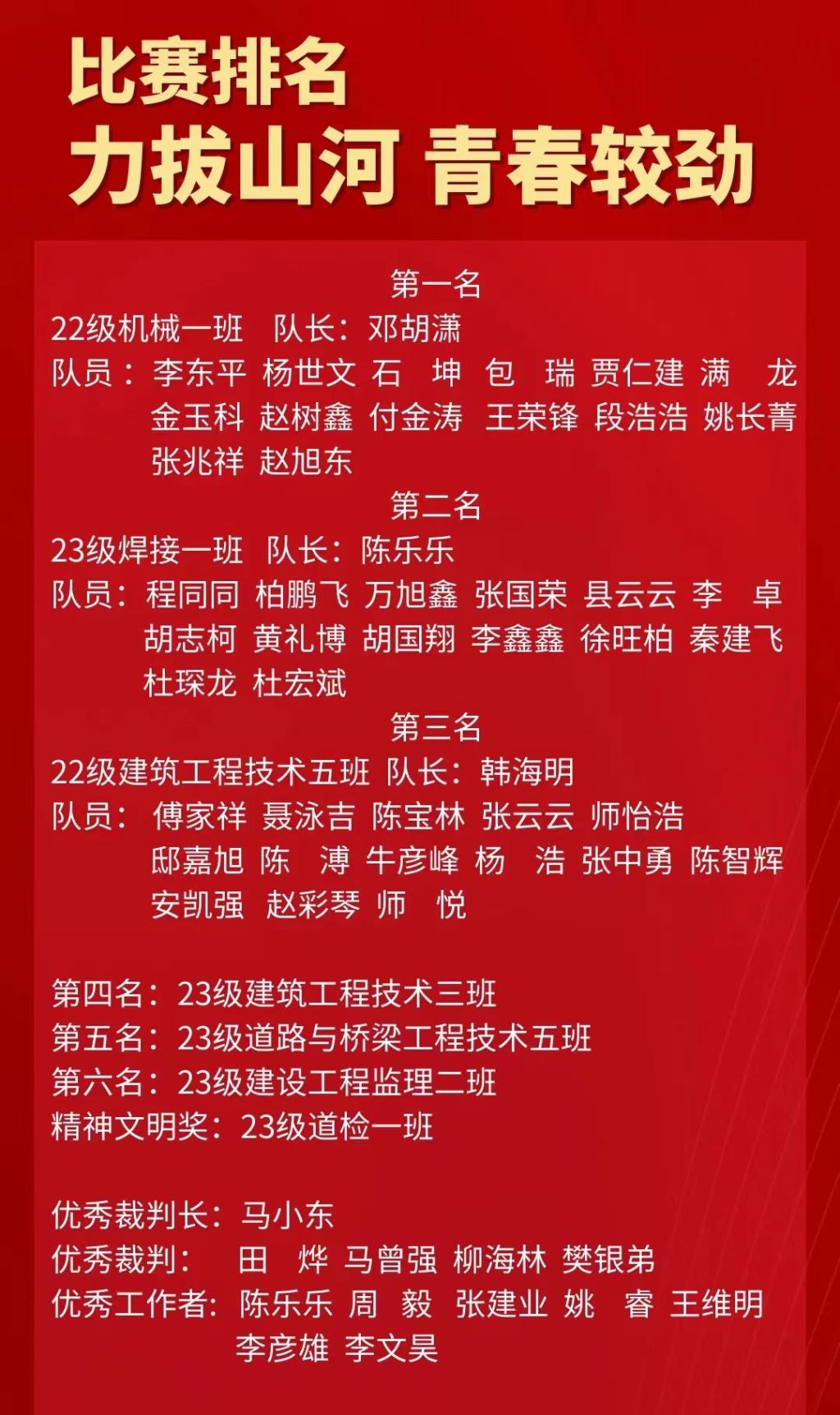 在本次联合比赛之前,建筑工程系内部进行了选拔赛,通过选拔赛从二十四支队伍中选出了六支参赛队伍,和交通工程系的六支参赛队伍进行比赛,选拔赛期间,系部各班级选手们全力以赴,为了班级荣誉,齐心协力、重心后移,双脚蹬地,充分诠释了“技”与“力”较量之美,拔出了“力拔山兮气盖世”的气势。
