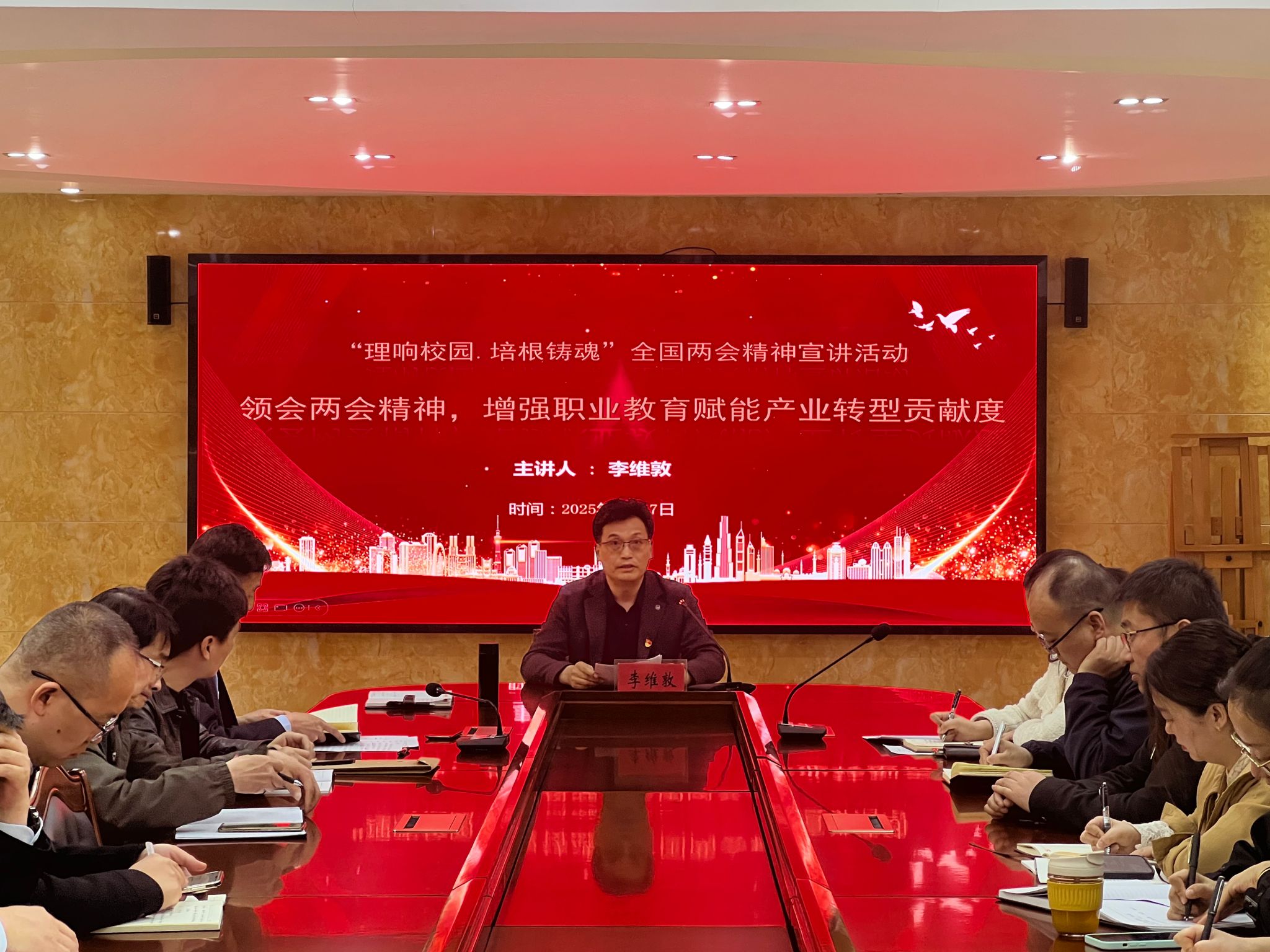 李维敦分别从"因地制宜发展新质生产力"、"谋划进一步全面深化改革重大举措"、“统筹推进科技创新和产业创新”以及“大国工匠是我们中华民族大厦的基石、栋梁”这四个部分深入联系两会精神,结合职业教育展开宣讲。