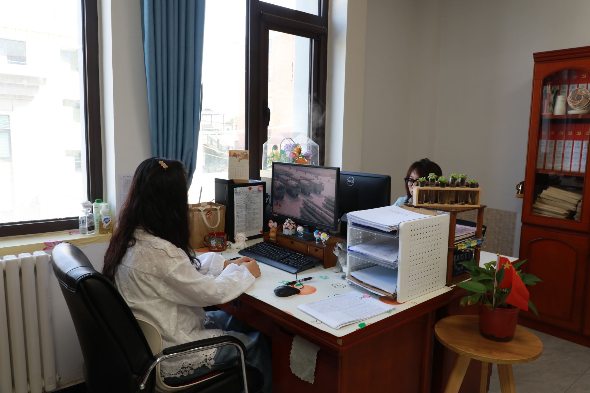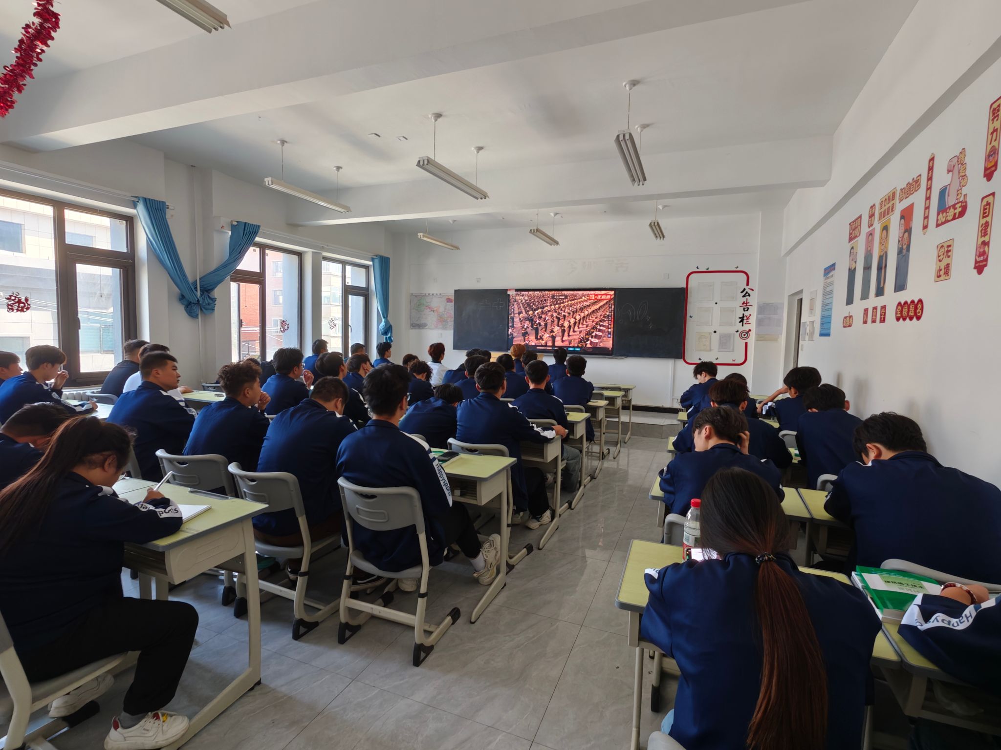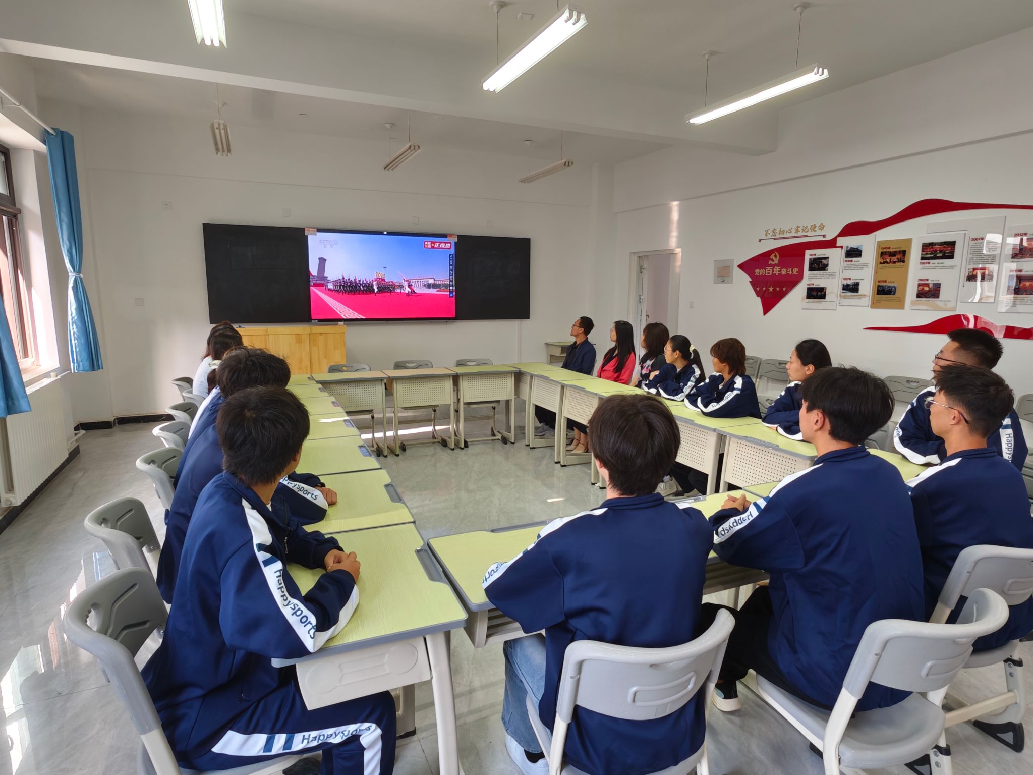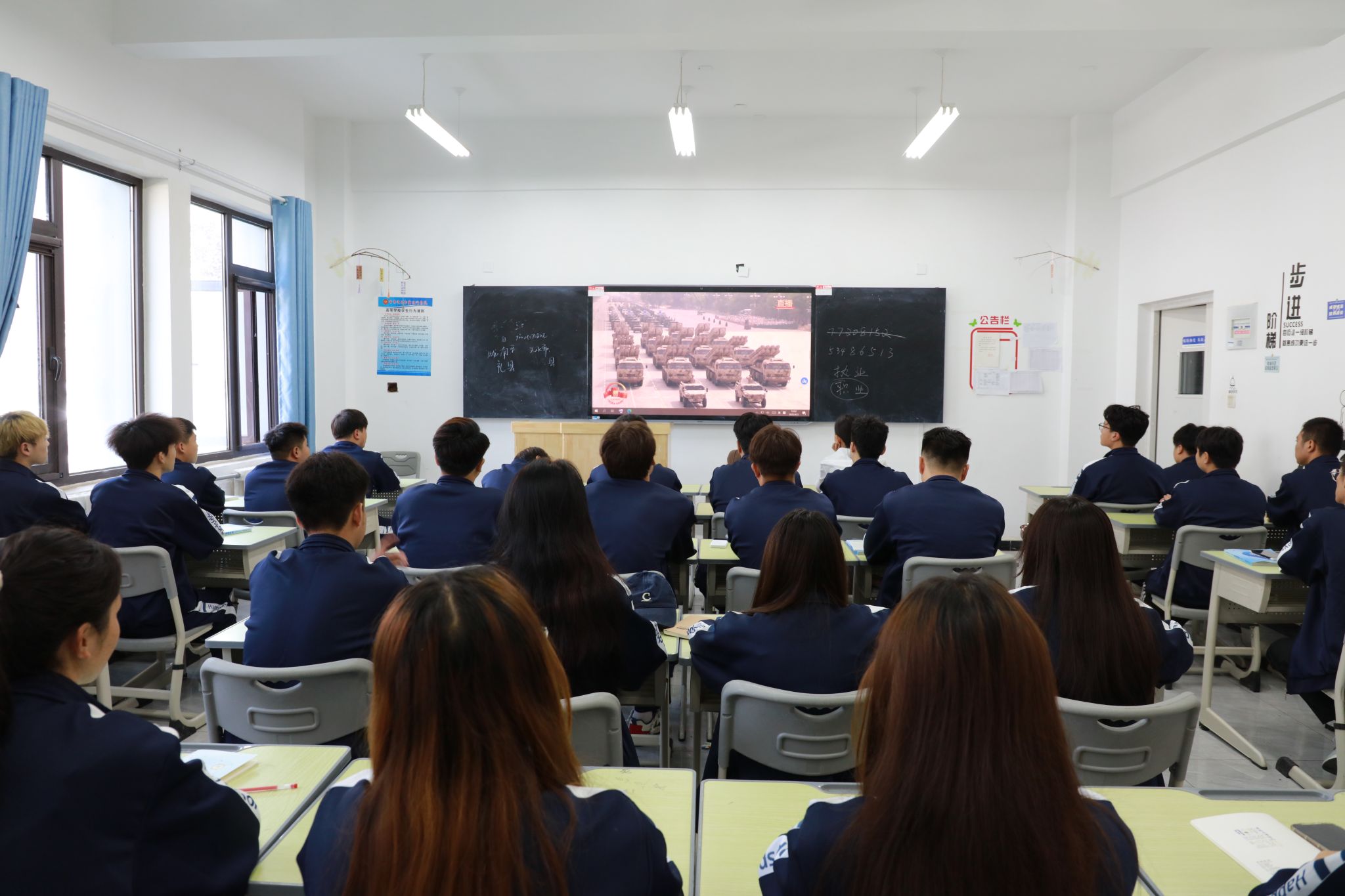 党团活动室、学生教室和教师办公室内,庄严肃穆。师生们认真聆听总书记的重要讲话,专注地观看阅兵式的每一个环节。空中护旗梯队率先通过天安门广场,全世界昭告正义必胜、和平必胜、人民必胜的伟大真理;战旗方队代表着千千万万浴血于抗日烽火的英雄们积攒的累累战功,寓意着伟大的抗战精神接续传承;当阅兵式进行到装备方队环节时,师生们不时发出阵阵赞叹声,为中国人民解放军的强大和国家的繁荣昌盛感到自豪。